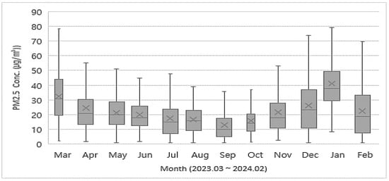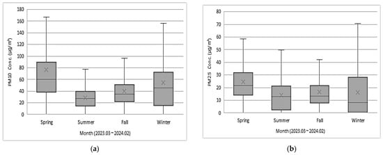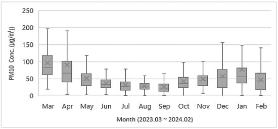 Real-time monitoring was carried out in a one-year cycle from March 2023 to February 2024, but machine errors or malfunctions often occurred during the measurement period. Therefore, the real-time measured data included the Not Detected (N.D.) data for each hour, which was 13 h for PM10 and 19 h for PM2.5. The measured data were collected and organized in Microsoft Excel, and the hourly average concentration, monthly average concentration, and seasonal average concentration were calculated, and graphs were generated. In addition, a two-way ANOVA was applied using Statistical Package for the Social Sciences (SPSS) to compare the statistical differences between the monthly and seasonal data. Since the number of measured data points totaled more than 30, the data were normally distributed according to the central limit theorem.