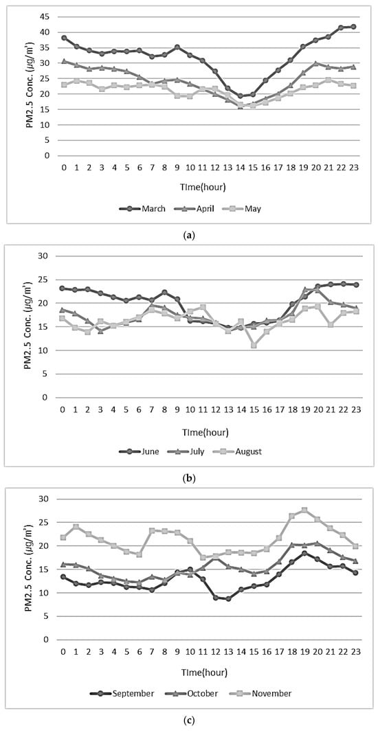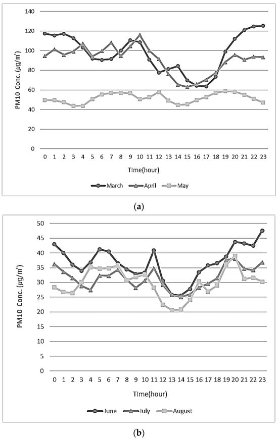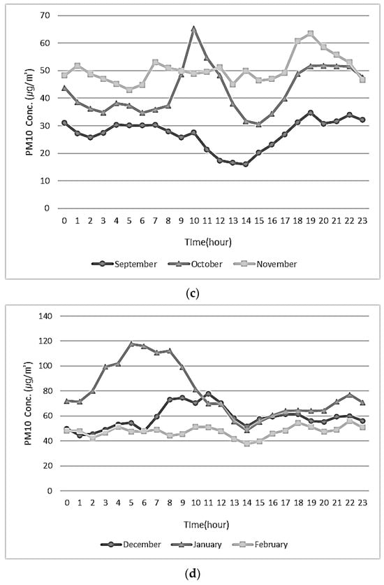 By time of day, concentrations were higher in the middle of the night compared to the day, except in March, and gradually decreased as the sun grew brighter. In March, there was a trend of increasing from 5 am, peaking at 10 am, and then decreasing significantly. In summer, concentrations were higher in the late night and early morning compared to the afternoon. In autumn, concentrations were higher in the evening compared to the afternoon in September and November, and tended to decrease later in the evening. In contrast to September and November, October showed an increasing trend from 0:00, peaking at 18:00 and then decreasing again. In December, concentrations were higher in the morning and evening compared to the afternoon, with a peak in the evening in January, and in February, as in December, concentrations were higher in the morning and evening compared to the afternoon. Overall, PM2.5 concentrations were found to be higher at dawn, in the morning, and at night when temperatures were lower. This suggests that PM10 concentrations are associated with temperature. Li et al. [29] found that PM10 and PM2.5 emission concentrations were correlated with air temperature, with the highest concentrations occurring at night and in the evening, and the lowest concentrations occurring around noon. In addition, a previous study conducted in agricultural areas (fields) in 2020 concluded that although PM2.5 concentrations varied by season, they were generally higher in the early morning and nighttime hours, which could be attributed to the air temperature inversion layer phenomenon [14].