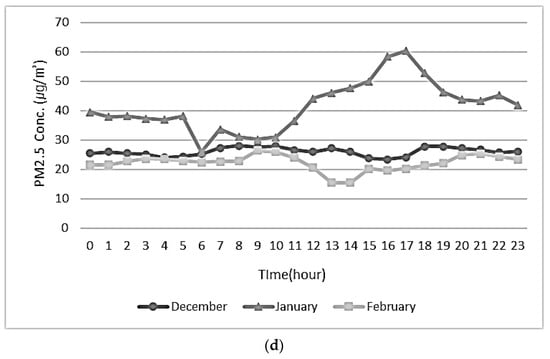 Hourly concentration patterns of PM2.5 in paddy field areas. (a) Spring (March~May); (b) Summer (June~August); (c) Fall (September~November); (d) Winter (December~February).