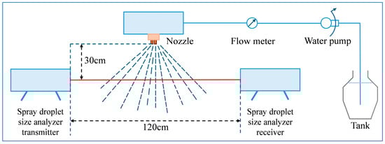 Measurement of spray nozzle atomization performance. The nozzle is positioned 30 cm above the midpoint between the emitting and receiving ends of the laser droplet sizer. By controlling the water pump and observing the flow meter, the flow rate of the nozzle is adjusted.