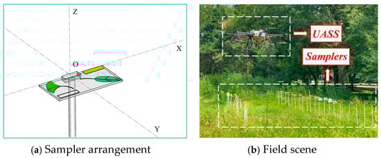 Figure 2 showed the schematic diagram of the field spraying experiment. The site was divided into 9 identical rectangular plots. A total of 45 sampling points were set up in 3 rows and 15 columns along the center line of the rectangular plots, with an interval of 0.5 m between points. The PVC plate used to fix the sampler was supported by a PP-R pipe, which was installed vertically in the ground. The length of the underground portion of the PP-R pipe was 0.2 m, and the length of the above-ground portion was 1 m. The UASS flew back and forth along the planned path.