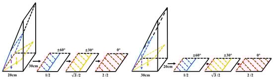 Figure 4. Projection schematic. The blue, yellow and red lines in the figure correspond to the projections for rotation angles of ±60°, ±30° and 0°, respectively. When the rotation angles are ±60°, ±30°, and 0°, the corresponding projection coefficients are cos (±60°), cos (±30°), and cos (0°), respectively. When rotating the same angles (±60°, ±30°, and 0°) around the OX and OY axes, the resulting projection areas are identical. The ratios of the projection areas to the area at 0° are 1/2, √3/2, and 2/2, respectively.