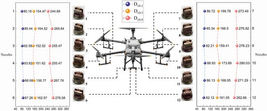 The distribution of the atomization performance of the 12 nozzles (DJI SX110015VS) selected for the test is shown in Figure 5. The VMD values of these 12 nozzles were measured to be in the range of 151.62 to 173.89 μm, which corresponds to the medium standard (150–190 μm, M) in the droplet size grading standard. It is noteworthy that the Dv0.9 values for nozzle 1 and nozzle 12 were smaller compared to the equivalent values of the other nozzles, which are 244.89 μm and 262.66 μm, respectively.
