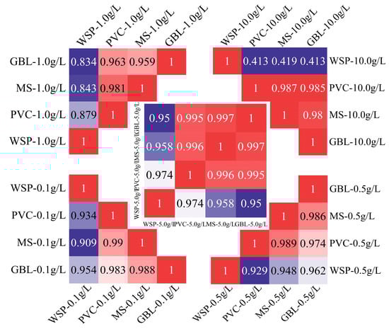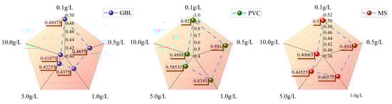 - Using a pipette (Beijing Dalongxingchuang Experimental Instrument Co., Ltd., Beijing, China), 5 concentrations (0.1–10.0 g/L) of RB solution were added uniformly to the 3 samplers (GMS, MS, and PVC card). The samplers were then placed at 30 °C, away from wind and direct sunlight, for 180 s. The samples were subsequently washed 3 times with distilled water, and the fluorescence value of each concentration was determined using a fluorescence spectrophotometer.