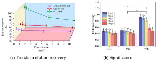 The elution recoveries for the three samplers (GBL, MS, and PVC card) are shown in Figure 6. The elution recoveries for each sampler were determined to range from 48.975% to 41.075% for GBL, 50.000% to 40.065% for MS, and 92.000% to 48.880% for PVC card, with variations in the concentration of the RB solution (0.1 g/L to 10.0 g/L).