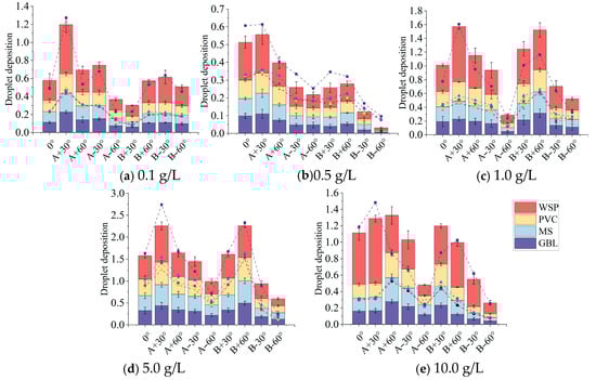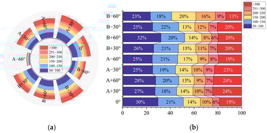 Figure 13a shows the statistical results of the number of droplets deposited on the WSP with different droplet size percentages for each angle range. The number of droplets was very small when the sampler angles were A − 60° and B − 60°, with average values of 69 and 309, respectively, from five spraying results. In contrast, when the samplers’ angles were A + 30° and B − 30°, the number of droplets was significantly higher, with average results of 536 and 535, respectively, from five repetitions of the data. The droplet size spectra of the deposited droplets on the WSP for each angle range are shown in Figure 13b. When the sampler angles were A ± 30° and A + 60°, the number of large droplets (>200 μm) increased significantly, reaching 41% and 40%, respectively. In contrast, when the angles were 0° and B + 60°, the number of large droplets (>200 μm) decreased to 38% and 34%, respectively, while the number of small droplets (<100 μm) increased significantly.