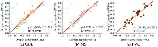 - Multi-angle linear fitting. The multi-angle linear fitting results of droplet deposition between the WSP and the three samplers are shown in Figure 12a–c. The fitting results are y = 1.50485x + 0.01295 (WSP–GBL, R2 = 0.86946), y = 1.47771x + 0.00785 (WSP–MS, R2 = 0.91436), and y = 1.39135x − 0.12789 (WSP–PVC, R2 = 0.82561). The data show that the R2 values after fitting for the three samplers are all above 0.82, indicating strong predictive capability.