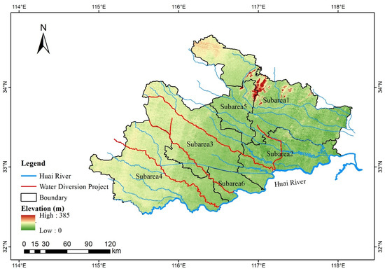 The Yangtze-to-Huai River water diversion project is a national key water conservancy project that transfers water from the Yangtze River basin to the Huai River basin through canals [41] (Figure 1). The total length of the water transfer line is 723 km [42], and the project’s first phase was tested for water passage at the end of 2021. The water-receiving area involves 55 counties in the Anhui and Henan provinces, covering a total area of 7.06 × 105 km2 [42]. Once completed, the project will effectively alleviate the shortage of drinking water and agricultural irrigation water in the northern Anhui and eastern Henan regions, as well as improving the ecological environment of the Huai River basin [43].