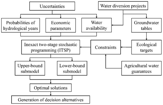 Figure 2 shows the general framework of this model. It is based on the ITSP technique, and the water diversion projects influence the model through water availability and the groundwater tables. Eventually, the model can generate future decision alternatives for different periods, like the year 2030 or 2040.