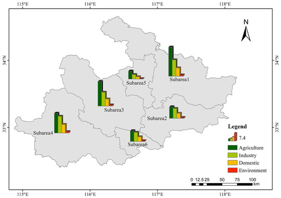The initial water allocation represents the optimal first-stage configuration. As shown in Figure 3, the allocated water volumes across the demand sectors are dominated by agriculture (52.5 × 108 m3), followed by industry (35.5 × 108 m3), domestic use (18.1 × 108 m3), and environmental needs (2.8 × 108 m3). Among sub-irrigation zones, Subarea1 receives the largest total allocation (27.9 × 108 m3), consistent with it having the largest irrigation area and highest agricultural water demand, due to its expansive irrigated cropland and reservoir capacity [37].