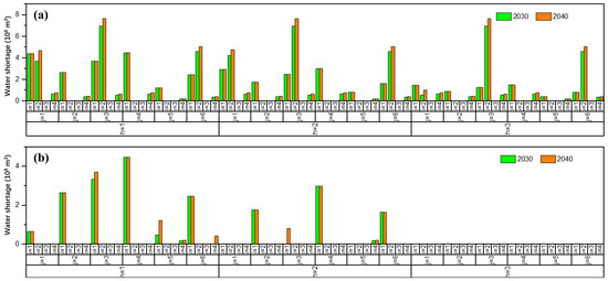The water deficits generated in the second-stage allocation reflect system state variations under prescribed uncertainties. As shown in Figure 4, the total water deficit in the agricultural irrigation district decreases with increasing water supply. Specifically, under dry hydrological conditions, deficits range from [14.3 × 108, 37.0 × 108] m3 in 2030 to [15.8 × 108, 39.6 × 108] m3 in 2040; for normal years, the values are [6.6 × 108, 31.2 × 108] m3 (2030) and [7.4 × 108, 33.3 × 108] m3 (2040); and in wet years, deficits further decrease to [0, 21.3 × 108] m3 (2030) and [0, 23.3 × 108] m3 (2040). Notably, despite increased diverted-water volumes from 2030 to 2040, the system-wide water deficit expands. This counterintuitive trend is likely due to accelerated water demand growth driven by socioeconomic development, which outpaces supply augmentation efforts [56].