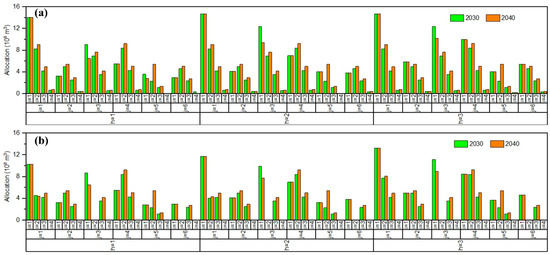 Following the two-stage allocation process, disparities emerge in water allocation fulfillment across sectors. Domestic water demands are fully satisfied according to the initial optimal allocations, while industrial sub-irrigation zones with higher economic benefit coefficients also adhere to their initial optimal allocations. Other sectors or subareas deviate from the optimal configuration. Agriculture and industry remain the two largest water-consuming sectors, as seen in other regions of the world [59,60,61]. From the upper-bound perspective (Figure 5a), agriculture dominates in 2030 (≥38.4 × 108 m3), followed by industry (35.5 × 108 m3), aligning with the initial optimization results. However, by 2040, this trend reverses: industrial allocations surpass agricultural ones (≤36.6 × 108 m3 for agriculture vs. 41.9 × 108 m3 for industry), reflecting a strategic shift under the principle of maximizing total system benefits. Increased water diversion capacity and economic growth drive prioritization of industrial use due to its higher economic return per unit water.
