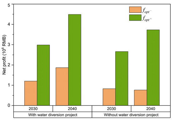 The water diversion projects enhance regional water supply capacity, significantly boosting economic benefits. Compared to scenarios without diversion, the upper bounds of the total benefits in 2030 and 2040 will increase by 0.3 × 108 CNY and 0.8 × 108 CNY, respectively. Concurrently, these projects will stabilize economic growth, reducing benefit fluctuation ranges by 0.05 × 108 CNY (2030) and 0.34 × 108 CNY (2040).