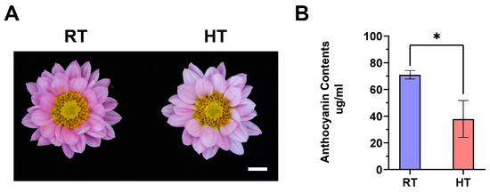 To investigate the effect of heat on anthocyanin metabolism in chrysanthemum petals, fully bloomed ‘Nannong Fencui’ plants were exposed to either a heat treatment (HT, 35 °C) or normal control conditions (RT, 22 °C), as detailed in the Methods (Section 2.1). After treatment, the flower color phenotype was assessed, and anthocyanin (cyanidin-3-glucoside) levels in the petals were quantified using ultra-performance liquid chromatography (UPLC). As shown in Figure 1, heat treatment caused noticeable petal fading, with anthocyanin content in the heat-treated group (37.850 µg/mL) significantly lower than in the control group (70.998 µg/mL). These results suggest that heat negatively impacts anthocyanin accumulation, leading to petal fading in chrysanthemums.