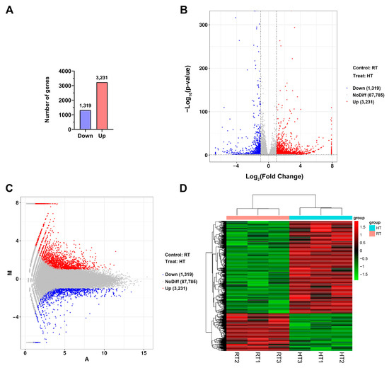 Analysis of differentially expressed genes (DEGs) between HT and RT groups. (A) Statistics of differentially expressed genes (DEGs). (B) Volcano plot of DEGs, where blue represents downregulated genes (DOWN; log2FoldChange < −1 and p-value < 0.05), gray indicates non-significant genes (NoDiff), and red marks upregulated genes (UP; log2FoldChange > 1 and p-value < 0.05). RT refers to the normal temperature control, whereas HT denotes the 35 °C heat treatment. (C) MA plot of DEGs. M represents the log2 fold change in gene expression between the HT and RT, while A represents the log2 mean expression level across both conditions. Upregulated genes in the HT group are marked in red, downregulated genes in blue, and non-significant genes in gray. (D) Heatmap of DEGs, illustrating gene expression patterns in HT and RT groups. FPKM values were Z-score normalized, with a color gradient representing relative gene expression: red denotes high expression, while green indicates low expression. Hierarchical clustering analysis was performed on both genes (rows, vertical axis) and samples (columns, horizontal axis) using Euclidean distance and the complete linkage method to construct dendrograms. The left-side dendrogram represents gene expression pattern similarities, identifying functional clusters associated with heat stress, while the top dendrogram illustrates sample clustering, confirming distinct gene expression profiles between the HT and RT groups.
