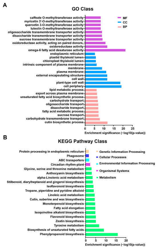 Gene Ontology (GO) functional classification and KEGG pathway enrichment analysis of differentially expressed genes (DEGs). The X-axis in both panels represents enrichment significance based on the p-value (−log10 transformed), where higher values indicate greater statistical significance. (A) Top significantly enriched GO terms categorized by function. MF (molecular function; purple), CC (cellular component; blue), and BP (biological process; pink) are shown. GO enrichment analysis was performed using the R package ‘topGO’, and significance was determined using the hypergeometric distribution method (p < 0.05). (B) Top 20 significantly enriched KEGG pathways for DEGs. Pathways are color-coded according to the main functional categories indicated by the legend on the right. KEGG pathway enrichment significance (p-value) was calculated using the hypergeometric test. Pathways with FDR < 0.05 were considered significantly enriched.
