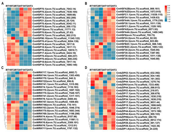 Analysis of heat stress-responsive genes based on transcriptome sequencing. The horizontal axis of the heatmap represents different samples, including the normal temperature control group (RT1, RT2, and RT3) and the heat treatment group (HT1, HT2, and HT3), while the vertical axis represents different genes. FPKM values were standardized using Z-score transformation, with a color gradient indicating relative expression levels: red represents high expression, while blue denotes low expression. Genes displayed in each panel were selected from the differentially expressed genes (DEGs; defined by p-value < 0.05 and |log2FoldChange| > 1) identified within each respective gene family. (A) Heatmap showing the expression of heat shock protein (HSP) genes. Displayed are the top 10 upregulated and top 10 downregulated HSP DEGs, ranked by fold change. (B) Heatmap illustrating the expression of heat shock transcription factor (HSF) genes. All 18 HSF genes identified as DEGs (12 upregulated and 6 downregulated) in this study are shown. (C) Heatmap displaying WRKY transcription factor gene expression patterns. Displayed are the top 10 upregulated and top 10 downregulated WRKY DEGs, ranked by fold change. (D) Heatmap representing the expression of bZIP transcription factor genes. All 5 downregulated bZIP DEGs identified in this study, along with the top 15 upregulated bZIP DEGs, ranked by fold change are shown (total 20 genes).