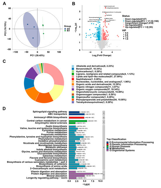 Untargeted metabolomic analysis of differentially accumulated metabolites in petals under heat stress. (A) Principal component analysis (PCA) model plot. This plot illustrates the overall distribution of samples based on mass spectrometry data. The position of sample points on the two-dimensional plane is determined by Principal Component 1 (PC1) and Principal Component 2 (PC2), where PC1 accounts for 39.45% of the total variance (ranging from approximately −100 to 100), and PC2 explains 19.76% of the variance (ranging from approximately −80 to 80). Blue dots represent the HT group, while green dots indicate the RT group. (B) Volcano plot of differential metabolites. This plot visualizes the differential accumulation of metabolites between the HT and RT groups. The x-axis represents log2(fold change), indicating the fold change in metabolite accumulation, while the y-axis represents −log10(p-value), reflecting the statistical significance of differences. Red dots indicate metabolites with increased accumulation in the HT group, while blue dots represent those with decreased accumulation. The dot size corresponds to the Variable Importance in Projection (VIP) score, highlighting metabolites that contribute most to group separation. Significantly differential metabolites were defined by a VIP > 1 and p-value < 0.05. Among these, upregulated metabolites (red dots) further met the criterion of fold change (HT/RT) > 1.5, while downregulated metabolites (blue dots) met the criterion of fold change (HT/RT) < 0.67 (approximately 1/1.5). (C) Pie chart of differential metabolite categories and their proportions. Each sector represents a metabolite category, with its area proportional to the number and percentage of compounds within that category. (D) KEGG enrichment pathway analysis of differential metabolites. This plot presents the KEGG pathway enrichment analysis results for differentially accumulated metabolites. The y-axis lists the metabolic pathways, with specific p-values labeled on the bars. The right panel categorizes these metabolic pathways based on their functional classifications. KEGG pathway enrichment significance (p-value) was calculated using the hypergeometric test. Pathways with FDR < 0.05 were considered significantly enriched.