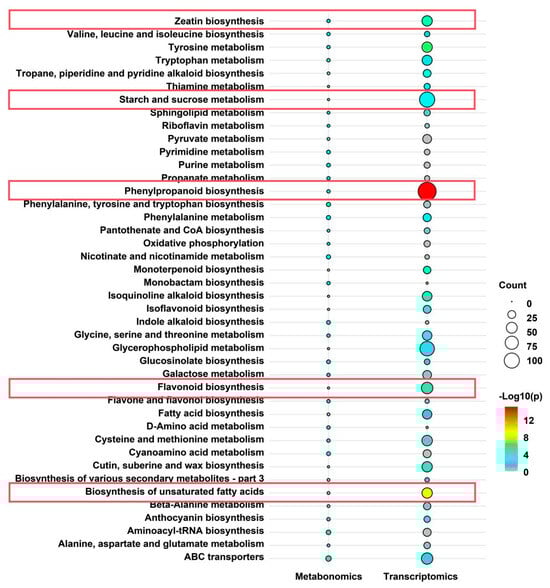 Integrated transcriptomic and metabolomic analysis. The figure illustrates 42 metabolic pathways found to be significantly enriched in both transcriptomic and metabolomic analyses. The x-axis represents metabolomics and transcriptomics, while the y-axis lists the shared metabolic pathways. Bubble color represents enrichment significance (−log10(p-value)), where higher values and redder colors indicate greater statistical significance (scale provided). Bubble size corresponds to the count value, representing the number of detected genes (transcriptomics) or metabolites (metabolomics) within the pathway (scale provided). Pathway enrichment analyses for both datasets were performed using the hypergeometric test. Pathways with a False Discovery Rate (FDR) < 0.1 were considered significantly enriched. Only pathways meeting this significance threshold (FDR < 0.1) in both omics datasets are displayed. The pathways of focus in this study are outlined in red boxes.