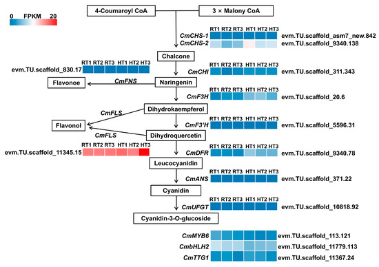 During the full-bloom stage, ‘Nannong Fencui’ chrysanthemums exhibited a decline in anthocyanin accumulation and petal fading following heat treatment (Figure 1). To investigate the underlying regulatory mechanisms, we conducted a differential expression analysis of the genes involved in anthocyanin biosynthesis using transcriptomic data. Our findings revealed that structural genes in the primary anthocyanin biosynthesis pathway had consistently low expression levels. Notably, CmCHS-1 (evm.TU.scaffold_asm7_new.842), CmF3′H (evm.TU.scaffold_5596.31), CmANS (evm.TU.scaffold_371.22), and CmUFGT (evm.TU.scaffold_10818.92) all had FPKM values of 0 in both the HT and RT groups (Figure 7). Heatmap analysis of gene expression (based on FPKM values) confirmed that heat stress had negligible effects on the expression of structural genes involved in anthocyanin biosynthesis (Figure 7). Regarding anthocyanin biosynthesis branch pathways, CmFLS (evm.TU.scaffold_11345.15), encoding flavonol synthase, maintained high expression (FPKM ≈ 15–20) under both conditions, whereas CmFNS (evm.TU.scaffold_830.17), involved in flavones synthesis, showed low expression. Similarly, genes in anthocyanin branch pathways exhibited negligible expression changes under heat stress (Figure 7). In chrysanthemums, anthocyanin biosynthesis is primarily regulated by the MBW complex, comprising CmMYB6, CmbHLH2, and CmTTG1 [28]. Transcriptomic analysis revealed low expression of CmMYB6 (evm.TU.scaffold_113.121), CmbHLH2 (evm.TU.scaffold_11779.113), and CmTTG1 (evm.TU.scaffold_11367.24) in both the HT and RT groups, with CmMYB6 expression declining under heat stress, as indicated by its average FPKM dropping from 2.76 to 1.92 (Figure 7). These findings suggest that, at full bloom—when anthocyanin accumulation peaks—anthocyanin biosynthesis in ‘Nannong Fencui’ is largely inactive. Consequently, heat-induced petal fading at this stage likely does not stem from direct suppression of anthocyanin biosynthesis.