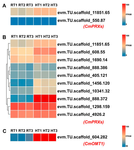 Heatmap showing the differential expression of candidate CmPRX and CmOMT1 genes potentially involved in anthocyanin degradation. The heatmaps display FPKM values, with lower expression levels represented in blue and higher levels in red. Note the different FPKM scales used for color mapping in panels (A,B) (0–100) versus panel (C) (50–150), indicated by the adjacent color bars. (A) Heatmap displaying the expression of chrysanthemum homologs of VviPRX31 (evm.TU.scaffold_11851.65) and BcPRX01 (evm.TU.scaffold_550.87). (B) Heatmap of 10 CmPRX genes identified as significantly upregulated under heat stress in this study. Hierarchical clustering was applied to rows (genes), generating a dendrogram to visualize similarities in expression patterns. (C) Heatmap of CmOMT1 (evm.TU.scaffold_604.282), the chrysanthemum homolog of AtOMT1, showing significant upregulation under heat stress.