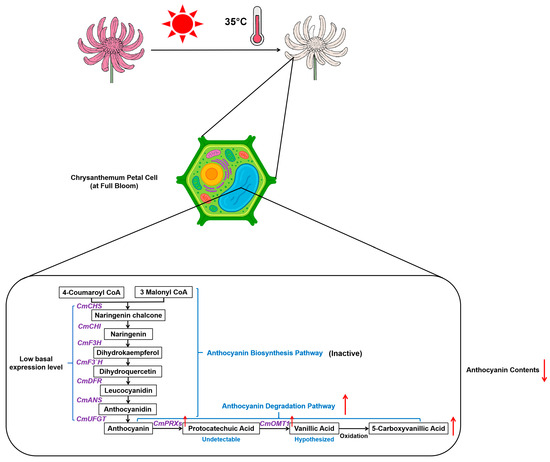 Proposed schematic model illustrating the mechanism of heat-induced anthocyanin degradation leading to petal fading in Chrysanthemum morifolium at the full-bloom stage. At the full-bloom stage, the anthocyanin biosynthesis pathway exhibits low basal transcriptional activity (indicated as “Inactive”), as supported by low FPKM values of key biosynthetic genes (see Figure 7). Upon exposure to heat stress (35 °C), anthocyanin degradation is preferentially activated rather than further suppression of biosynthesis. This response involves significant transcriptional upregulation (red arrows ↑) of key degradation-related enzymes, including class III peroxidases (CmPRXs) and O-methyltransferase 1 (CmOMT1). These enzymes are hypothesized to catalyze anthocyanin breakdown (indicated by red arrows ↓ for content decrease), potentially via intermediate metabolites such as protocatechuic acid (marked “Undetectable” based on experimental data) and vanillic acid (marked “Hypothesized”). This degradation cascade is proposed to result in the accumulation (red arrows ↑) of downstream products such as 5-carboxyvanillic acid, contributing to the observed reduction in anthocyanin levels and petal fading. Solid arrows indicate metabolic flow or enzymatic reactions.
