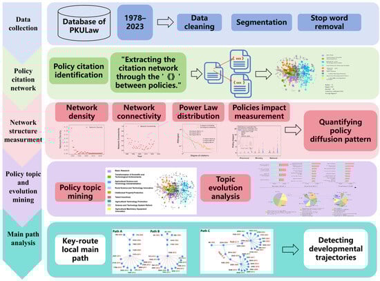 Drawing upon theories of social networks and knowledge diffusion, we propose a research framework based on citation relationships to analyze the diffusion patterns and evolutionary processes of ASTPs in China, as illustrated in Figure 1. Firstly, we organize and archive the policy texts, extracting metadata such as issuing agencies, implementation dates, and validity periods. Secondly, we identify citation relationships by recognizing quoted titles within the main text of the documents and use this information to construct a policy citation network. Then, we uncover diffusion patterns, topic dynamics, and developmental paths of ASTPs by applying network topology indicators, policy diffusion metrics, modularity-based clustering algorithms, and the Search Path Link Count (SPLC) method.