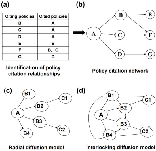 Construction of the policy citation network and diffusion patterns. (a) shows the identification of citation relationships among policies. (b) presents the resulting policy citation network, where each node represents a policy document and each directed edge indicates a citation from one policy to another, reflecting the direction of policy diffusion. (c) depicts a radial diffusion model, where one central policy document (A) diffuses to several subsequent policies (B1–B4 and C1–C2), indicating a hub-like diffusion structure. (d) illustrates an interlocking diffusion model, where multiple policies are interconnected through mutual citations, showing a more complex and entangled diffusion structure. In the figure, uppercase letters (A, B, C, etc.) represent different policy documents.