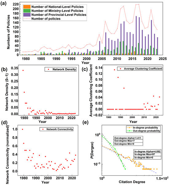 Patterns of Agricultural Science and Technology Policies (ASTPs). (a) Publication trends of ASTPs and their citation counts from 1980 to 2023, categorized by administrative level (national, ministry, and provincial). (b) Network density of ASTPs over time, indicating the proportion of actual to possible citation links (unitless, ranging from 0 to 1). (c) Average clustering coefficient, reflecting the degree to which policies tend to form citation clusters (unitless, ranging from 0 to 1). (d) Network connectivity, showing the extent of interconnectivity within the citation network (normalized score). (e) Citation degree distributions, including in-degree and out-degree probabilities on a log-log scale, illustrating the presence of power-law characteristics in citation behavior.