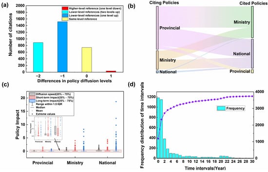 Diffusion patterns of ASTPs (a). Diffusion of policies between different administrative levels (b). Distribution of policy impact across provincial, ministerial, and national policies. The x-axis indicates policy levels, and the y-axis shows impact scores based on citation frequency. Gray dots represent diffusion speed, red dots indicate short-term impact (within 5 years), and blue dots represent long-term impact (after 5 years) (c). Time intervals of policy citations (d).