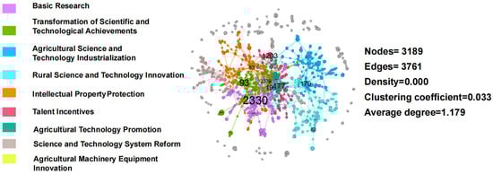 To ensure the relevance and consistency of the dataset, we performed a multi-step filtering process. First, we manually removed irrelevant or non-normative documents, including project approvals, announcements, planning documents, judicial interpretations, and internal work reports. We retained only those documents with explicit policy intent, such as regulations, guidelines, opinions, implementation measures, notices, decisions, and resolutions. Next, we applied a content relevance filter to exclude documents unrelated to agricultural science and technology, such as personnel appointments, reward and punishment notices, and digital formatting standards. After completing these screening procedures, we obtained a final dataset of 3207 valid ASTPs and 3776 citation links, which served as the basis for the analysis in this study.