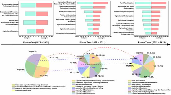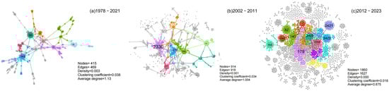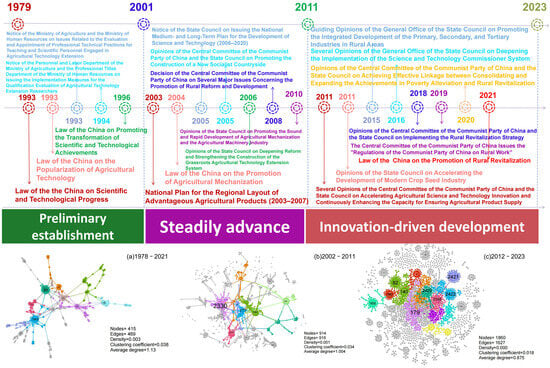 The topic dynamics of the ASTPs diffusion are examined by dividing the developmental stages of China’s agricultural science and technology in relation to shifts in policy quantity: the Initial Establishment Stage (1978–2001), the Steady Advancement Stage (2002–2011), and the Innovation-Driven Development Stage (2012 to 2023). A temporal citation network of policy diffusion is constructed based on policy citation (edge) relationships. At each stage, modular algorithms are employed to identify key policy topics from dynamic citation networks, and variations in their structural attributes are analyzed to uncover the evolution of China’s agricultural science and technology priorities. Three temporal policy citation networks are constructed using Gephi software (version 0.10.0) and are presented in Figure 6.