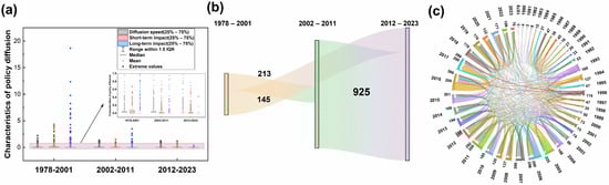 In the Preliminary Establishment Stage (1979–2001), during the initial stage of reform and opening-up, China’s agricultural science and technology experienced comprehensive and rapid recovery and development, and China’s ASTPs entered the Preliminary Establishment Stage. A total of 415 ASTPs were issued by 148 administrative agencies, with 55.90% originating from the State Council and its ministries, whereas local governments contributed a relatively smaller portion. Additionally, only 64 joint policies were published. These features reflect insufficient policy coordination at the national level in the development of ASTPs. During this period, policy themes were mainly concentrated on strategic frameworks, the dissemination of technology, and the promotion of agricultural innovations. Key policies such as the “Decision of the Central Committee of the Communist Party of China on the Reform of the Science and Technology System” (ID: 149), “Law of the People’s Republic of China on Scientific and Technological Progress” (ID: 88), and “Law of the People’s Republic of China on Agricultural Technology Promotion” (ID: 83), were promulgated to enhance the technological planning system and promote agricultural technology dissemination. As shown in Table 3, although the number of ASTPs released during this period was relatively low, the diffusion activities were more active and frequent. A total of 405 ASTPs were issued during this stage, generating 464 citations within the same period and 358 cross-stage diffusion links. To more effectively illustrate topic associations across different stages, we constructed a dynamic diffusion flow chart for ASTPs. As depicted in Figure 7, a majority of these policies—59.49%—were cited by policies issued between 2012 and 2023. Notably, this stage demonstrates the shortest average time interval of policy diffusion, while exhibiting the highest average diffusion speed, as well as the most significant short-term and long-term impacts.
