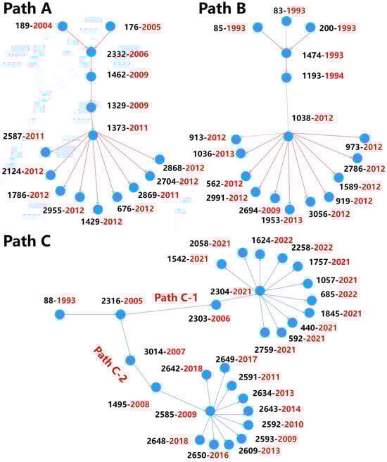 Main paths of ASTPs diffusion (main citation-based diffusion paths identified from the policy citation network. Nodes represent individual policy documents, and edges indicate citation relationships. The red text indicates the publication year of each policy, helping to visualize the temporal flow of diffusion across Paths (A–C)).