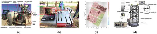 Representative Precision-Spraying Technologies: (a) LiDAR-guided variable-rate sprayer [26]; (b) Machine vision sprayer [27]; (c) Prescription map variable-rate sprayer [29]; (d) Multi-sensor fusion sprayer [33].