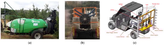 Various Orchard-Spraying Machines: (a) Mounted sprayer [25]; (b) Self-propelled sprayer [74]; (c) Electrostatic sprayer/Pneumatic atomization sprayer [75].