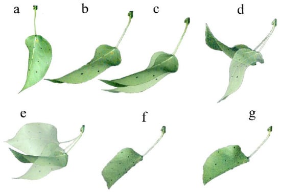 Deformation and vibration of pear leaves under different wind speeds: (a) u = 0 m/s; (b) u = 2.0 m/s; (c) u = 2.5 m/s; (d) u = 3.0 m/s; (e) u = 3.5 m/s; (f) u = 4.0 m/s; (g) u = 8.0 m/s [104].