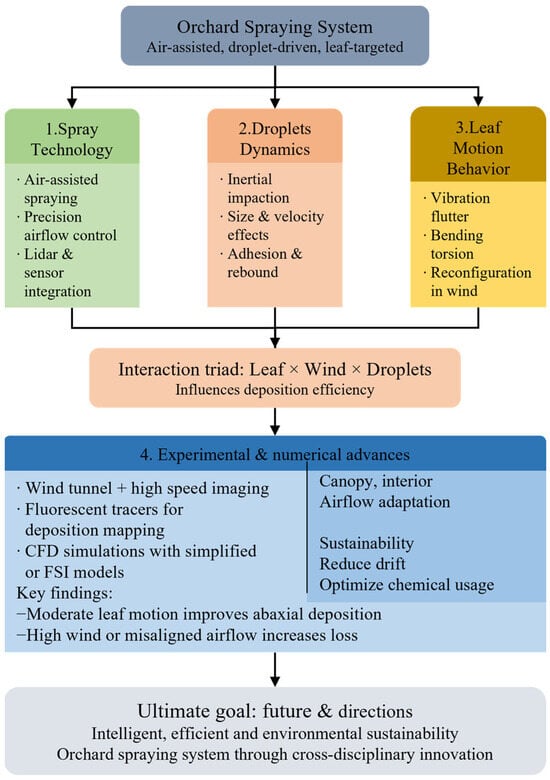 This review systematically synthesizes global research on the motion characteristics of peach tree leaves under coupled wind-droplet fields. It first provides an overview of air-assisted spraying principles and equipment evolution, then analyzes current precision-spraying trends and key factors affecting effectiveness, and finally examines droplet deposition patterns within canopies together with leaf dynamic responses to airflow and droplet impacts. Finally, the review identifies current limitations and outlines future research directions to guide the development of optimized spraying strategies and next-generation equipment.