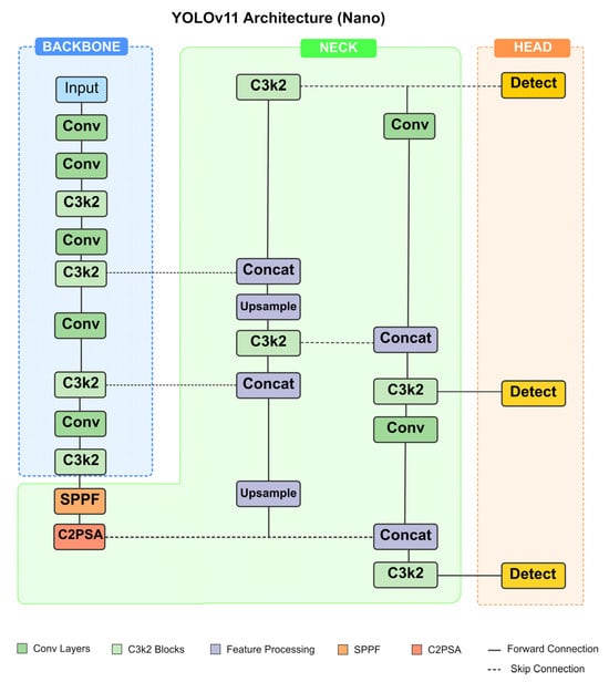 Figure 2 depicts the architecture diagram of the YOLOv11 network. The network comprises three main components: backbone, neck, and head. The backbone essentially functions as a feature extraction network that processes input images to derive hierarchical visual representations. The neck consists of intermediate layers that connect the backbone to the head, enhancing feature fusion across different scales. The head is the final detection layer that takes features from the neck and outputs the final predictions. The backbone incorporates multiple convolutional layers frequently followed by C3K2 blocks—an architectural innovation designed to improve feature aggregation. The architecture also incorporates a new spatial pyramid pooling—fast (SPPF) layer to perform multi-scale feature extraction by applying max-pooling operations at different kernel sizes to capture information at various receptive fields in a more efficient way than the original SPP. The architecture additionally utilizes skip connections (pathways that allow information to bypass one or more layers), which enable the network to preserve and utilize features from earlier layers, combining low-level details with high-level semantic information.
