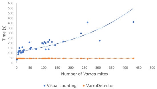 In terms of counting efficiency, the VarroDetector method demonstrated a stable processing time, unaffected by the number of Varroa mites on the sticky sheets. In contrast, visual inspection became increasingly time-consuming as mite numbers grew, following an exponential pattern. Similar results were also obtained when testing the commercial BeeVS scanner [22]. Moreover, the VarroDetector offers the possibility of analysis of an unlimited number of images in one step, ensuring that the processing time is not a constraint, as the operator can attend to other tasks, while the system handles the analysis.