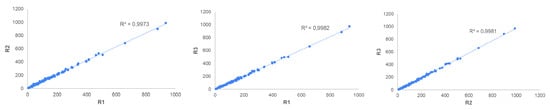 Linear correlation between VarroDetector replicates as a function of image orientation (R1 long side of the sheet in the same orientation as in the colony seen from behind, R2 90° rotation from the initial position, and R3 180° rotation from the initial position.