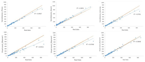 Figure 8 shows the correlations between the replicates of the visual observations and of the VarroDetector from images captured with different Smartphones with respect to the real data (control). The higher reliability was obtained with the VarroDetector software combined with the iPhone (R2 = 0.991) followed by the Xiaomi (R2 = 0.985) and Observer 3 (R2 = 0.985). The results obtained from images captured with the Samsung smartphone, for which VarroDetector had not been previously trained, were slightly lower than those of the other two smartphones but still acceptable (R2 = 0.978). When comparing to the reference line, all the methods, except the VarroDetector using the Xiaomi smartphone (that captured the images at higher resolution), underestimated the number of Varroa, with higher deviations in high-density regions.