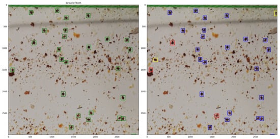 Crop of an image in which ground truth Varroa are highlighted in green on the left, while on the right, Varroa mites detected by VarroDetector are shown in blue, false negatives in red, and false positives in yellow.