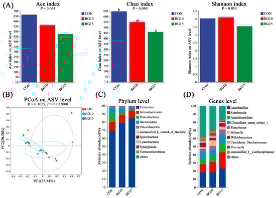 Fecal microbiota alteration after BG treatment. (A) Ace, Chao, and Shannon indexes; (B) PCoA analysis based on Bray–Curtis dissimilarity and ANOSIM analysis; (C) fecal microbiota at phylum level; (D) fecal microbiota at genus level. CON = control group; BG10 = 10% BG group; BG15 = 15% BG group; PCoA: principal coordinate analysis; ASV: amplicon sequence variants; PC1: first principal component; PC2: second principal component; a–c mean values within the row, unlike superscript letters, were significantly different (p < 0.05).
