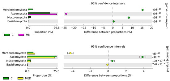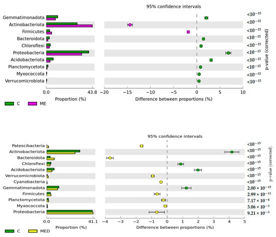 - Parks, D.H.; Tyson, G.W.; Hugenholtz, P.; Beiko, R.G. STAMP: Statistical analysis of taxonomic and functional profiles. Bio-informatics 2014, 30, 3123–3124. [Google Scholar] [CrossRef]