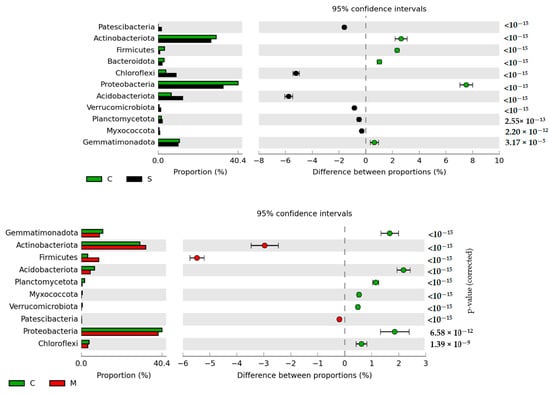 - Parks, D.H.; Tyson, G.W.; Hugenholtz, P.; Beiko, R.G. STAMP: Statistical analysis of taxonomic and functional profiles. Bio-informatics 2014, 30, 3123–3124. [Google Scholar] [CrossRef]
