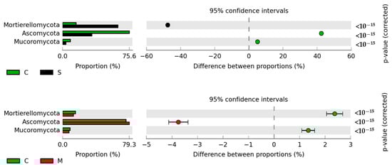 Fungi of the phylum Ascomycota were most abundant in all treatments (Figure 5). Their relative abundance ranged from 33.05% (S) to 99.46% (ME). Fertilization with antibiotic-free manure (C) increased the relative abundance of fungal phyla Ascomycota (by 42.52%) and Mucoromycota (by 5.10%) but led to a significant decrease in the relative abundance of Mortierellomycota (by 47.56%). Antibiotics induced significant changes in the structure of fungal communities at the phylum level. In comparison with the antibiotic-free treatment (C), the relative abundance of Ascomycota increased by 3.75% in response to M and by 23.89% in response to ME but decreased by 3.87% under the influence of MED. Fungi of the phylum Mortierellomycota responded differently to the application of manure containing antibiotics. The abundance of Mortierellomycota decreased by 2.35% in treatment M and increased by 4.26% in treatment MED. The relative abundance of Mucoromycota decreased in response to M, ME, and MED.