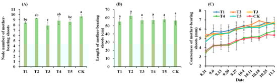 The effects of different treatments on the node number (A), the length (B), and the coarseness (C) of mother-bearing shoots of ‘Zaoxu’. Each value in the graphs shows a mean with the standard deviation of three replicates. Different lowercase letters indicate significant differences according to Duncan’s multiple range tests (p < 0.05). T1, T2, and T3 are 500×, 1000×, and 1500× dilutions of organic water-soluble fertilizer. T4 and T5 are 500× and 1000× dilutions of microbial fertilizer. CK: control.