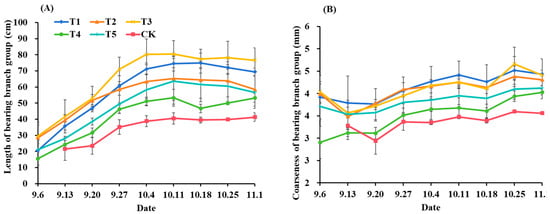 The effects of different treatments on the length (A) and coarseness (B) of the bearing branch group of ‘Zaoxu’. Each value in the graphs shows the mean of three replicates. T1, T2, and T3 are 500×, 1000×, and 1500× dilutions of organic water-soluble fertilizer. T4 and T5 are 500× and 1000× dilutions of microbial fertilizer. CK: control.