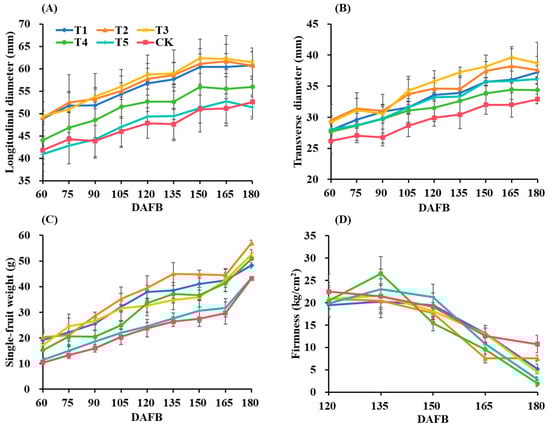 The effects of different treatments on the longitudinal diameter (A), transverse diameter (B), single-fruit weight (C), and firmness (D) of ‘Zaoxu’ fruit. Each value in the graphs shows the mean of fifteen replicates. T1, T2, and T3 are 500×, 1000×, and 1500× dilutions of organic water-soluble fertilizer. T4 and T5 are 500× and 1000× dilutions of microbial fertilizer. CK: control.